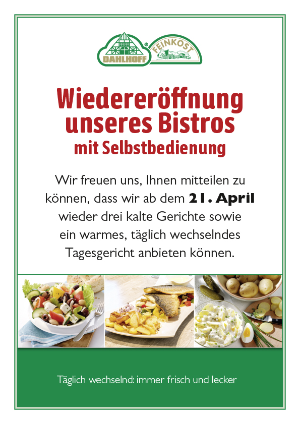 Nach über einem Jahr Planungs- und Bauzeit ist es endlich soweit, dass wir am 04. Juli unseren neuen Feinkost-Shop eröffnen. Wir hoffen, dass diese neue Einkaufsstätte und unser neues Bistro eine Bereicherung für die Stadt Haltern werden wird. Wir freuen uns auf Ihr Kommen und wünschen Ihnen guten Appetit!